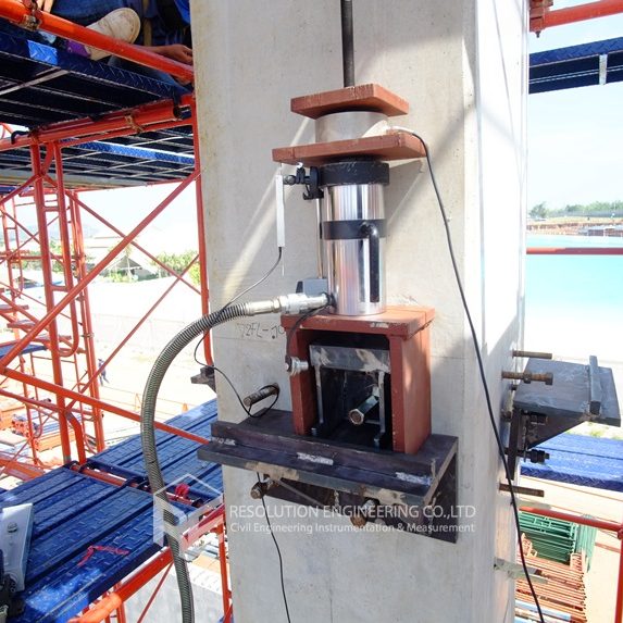 Furthermore, RE also offers the Shearing Test which is another test used to determine an anchor’s load carrying capacity. This test specifically determines the shear capacity of the tested anchor. The tested load will be applied in the perpendicular direction to the anchor using a hydraulic pump with a load measuring system. A displacement transducer is also installed to measure displacement.